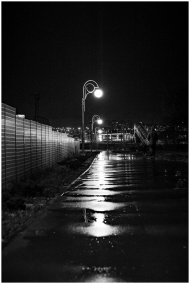 Black and white street photo capturing tranquil night scene with reflective wet pavement and glowing streetlights.