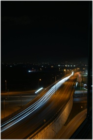 Aerial view of a nighttime city highway with long exposure light trails creating a dynamic visual effect.