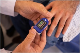 Close-up of a doctor's hand using a pulse oximeter on a patient's finger in a hospital setting.