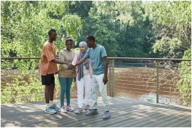 A diverse group of friends joining hands on a sunn
