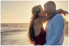 Young couple sharing a romantic kiss on a beach at