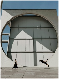 Silhouettes of two dancers pose dynamically against a modern Berlin architectural backdrop.