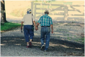 Senior couple holding hands and walking outdoors on a gravel path, showcasing love and companionship.