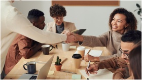 Colleagues collaborating indoors, sharing smiles, and shaking hands during a business meeting.