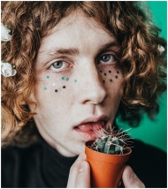 Artistic portrait featuring a young person with face stars and a small cactus.