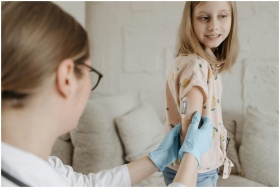 A young girl receives an insulin checkup from a medical professional at home, managing diabetes.
