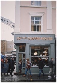 A bustling London street with people walking past a charming coffee house under a market archway.