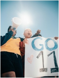 Group of enthusiastic people cheering outdoors, holding a sign with 'GO 11' under bright daylight.