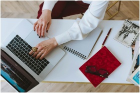 Overhead view of a workspace featuring a laptop, notepad, and eyeglasses.