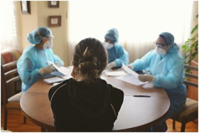 Health professionals in protective gear consulting with a patient indoors, focusing on COVID-19 precautions.