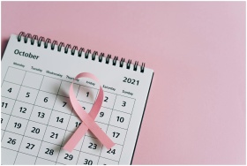 Close-up of a pink ribbon on an October 2021 calendar, symbolizing breast cancer awareness.