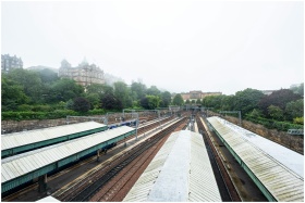Misty morning view of train tracks and classic buildings in Edinburgh, Scotland.