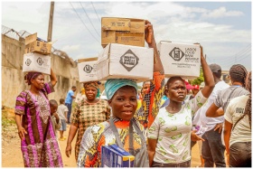 People carrying charity boxes during a community distribution event in Lagos.
