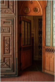 Beautifully carved wooden doorway showcasing intricate designs and vintage stained glass.