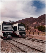 Two modern trains on tracks with mountains in Maimara, Jujuy, Argentina.