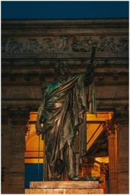 A striking view of the Mikhail Kutuzov monument in St. Petersburg, captured during a serene night.