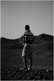 Black and white photo of a man standing in the desert of Marsa Alam, Egypt.