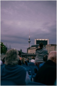 Tourists in Berlin admire the Fernsehturm amidst the cityscape at dusk.