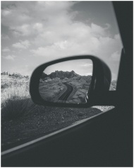 Artistic photo capturing desert landscape in car side mirror, creating a moody travel vibe.