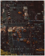 Aerial view of a busy intersection in Queens, NY, with cars, taxis, and pedestrians.