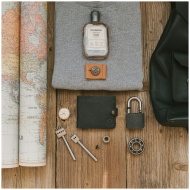 Flat lay of travel items including a map, wallet, watch, padlock, and fragrance on wooden surface.
