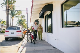 An elderly couple walks hand in hand outside a sho