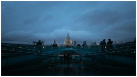 Dramatic evening shot of St Paul's Cathedral in London from Millennium Bridge with silhouettes.
