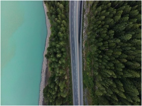 Aerial view showcasing a serene road bordered by lush forest and a turquoise lake in Whistler, BC.