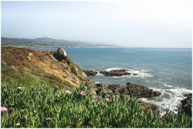 Beautiful view of the California coastline with cliffs, ocean, and blooming wildflowers.