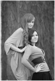 Stylish black and white portrait of two women outd