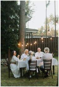A group of senior adults enjoying a meal together in a lush outdoor setting.