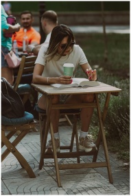 A woman enjoys reading and sipping coffee outdoors