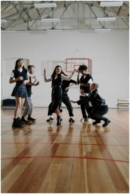 A lively group of teenagers enjoying dance on a school gym basketball court.