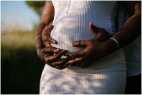 Couple embracing tenderly over a pregnant belly, symbolizing love and togetherness.