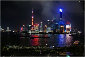 Illuminated Shanghai skyline with reflections on H