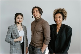 Three diverse customer support representatives wea