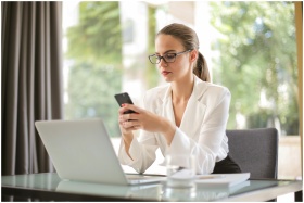 Concentrated young woman in formal clothes and eyeglasses sitting at glass table with laptop while surfing smartphone