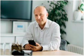 Businessman in a white shirt sitting in a modern office, holding a smartphone, and looking confident.