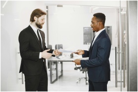 Two businessmen in formal suits exchanging documents in a modern office setting, symbolizing collaboration and partnership.