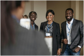 Three business professionals smiling at a corporate event, wearing formal attire and badges.