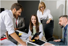 Diverse team collaborating with digital tablet during an office meeting. Perfect for business and teamwork themes.
