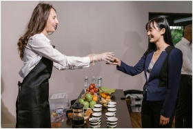 Two professionals interacting at a catered business event with coffee and fruit.