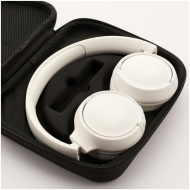 High-quality white wireless headphones resting in a protective carrying case.