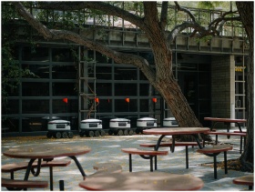 Autonomous delivery robots stationed outside in a modern and empty courtyard.