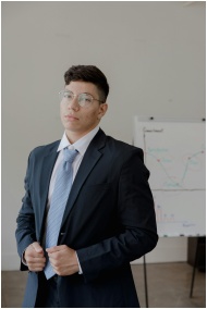 Confident young adult in black suit indoors near flip chart.