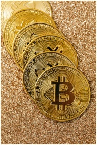 Golden Bitcoin cryptocurrency coins stacked on a g