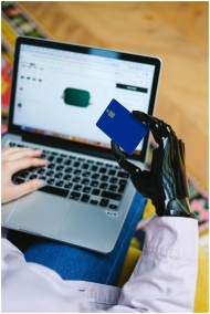 Person with prosthetic hand using laptop for online shopping, holding a credit card.