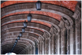Detailed view of stone arches with lamps in Cuauhtémoc, Mexico City, highlighting architectural elegance.