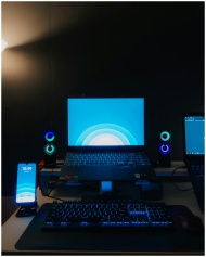 A sleek, technology-focused workspace featuring a laptop and smartphone with vibrant lighting.