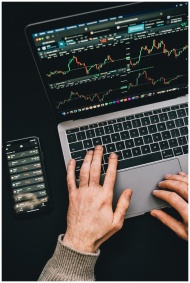 Hands typing on a laptop with cryptocurrency chart